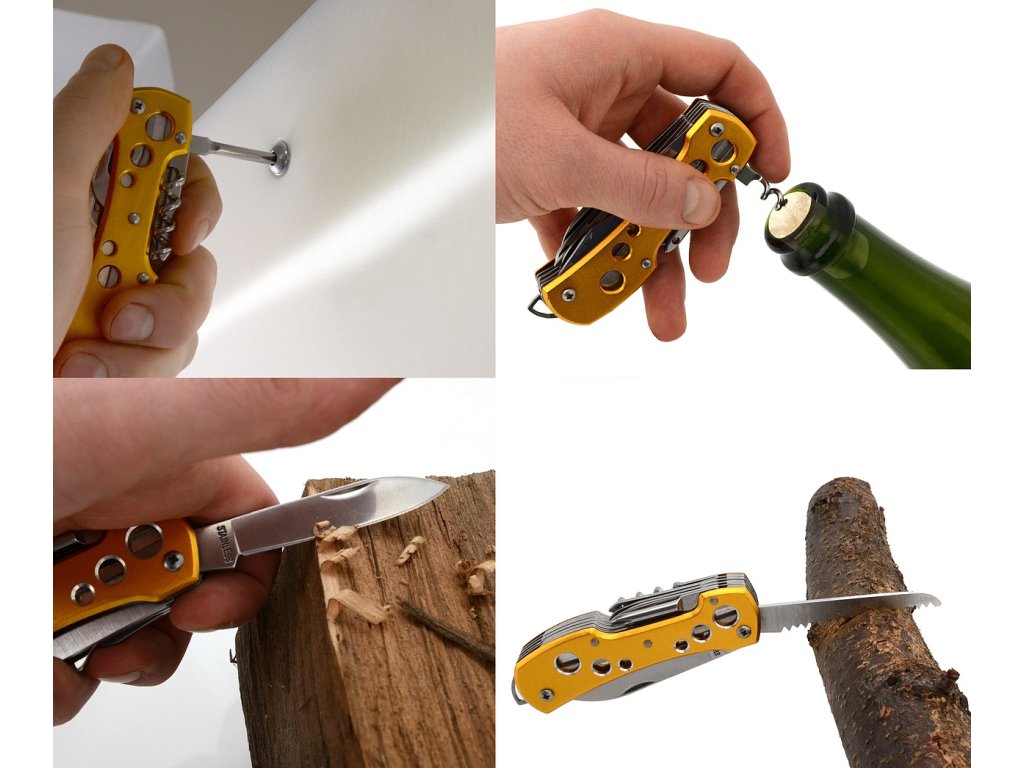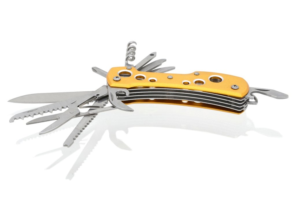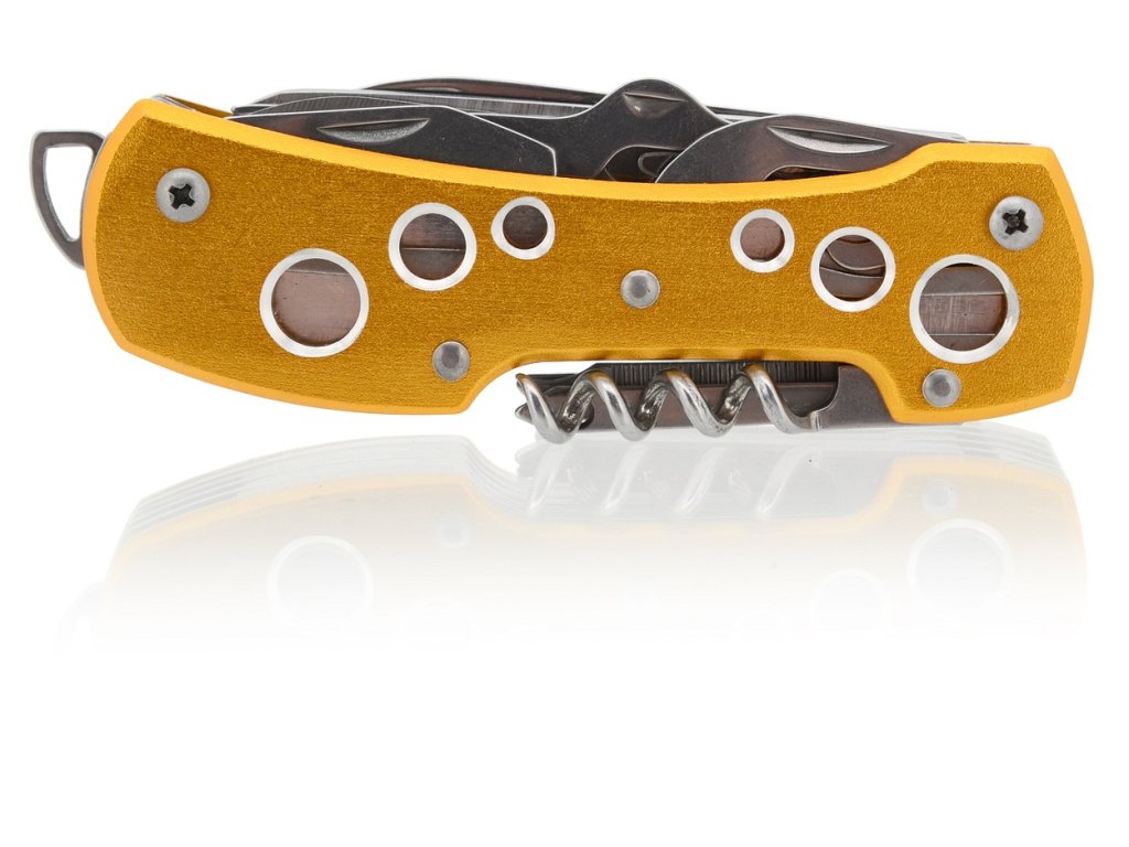 Rukoväť je kvalitne spracovaná z alumínia, farbeného žltou až zlatistou farbou s perforáciou vrchnej aj spodnej strany. Nožík vďaka svojim funkciám, nájde uplatnenie naozaj všade a je dobré ho mať po ruke kedykoľvek a kdekoľvek.