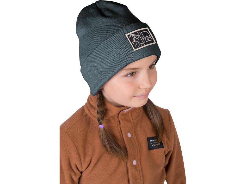 Zimná detská čiapka má jednofarebné prevedenie a moderný dizajn. Čiapka dobre sedí a drží na hlave vďaka širokému vyhrnutému lemu. Dekoratívna nášivka s motívmi hôr na strede vyhrnutého lemu. Príjemný materiál je kompozíciou 50% recyklovaného polyesteru a 50% akrylu.