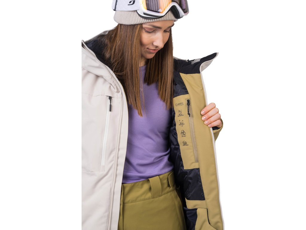 Lyžiarska bunda v technickom strihu má pružný materiál ošetrený vrchnou vodoodpudivou úpravou. Membrána Climatic Element s parametrami 10 000mm vodný stĺpec a 10 000 priedušnosť ťa spoľahlivo ochráni proti premoknutiu pri zachovaní priedušnosti.