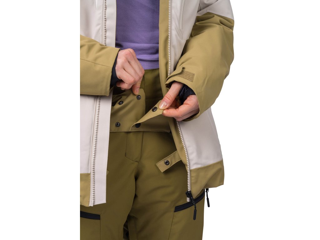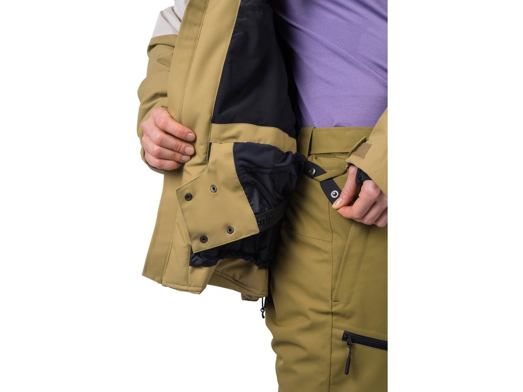 Vnútorné elastické rukávové manžety s otvorom na palec znižujú únik tepla a zároveň zaistia, aby sneh zostal tam kde má. Systém prepojenia bundy a nohavíc umožňuje ľahké pripnutie lyžiarskych nohavíc Hannah Soren.
